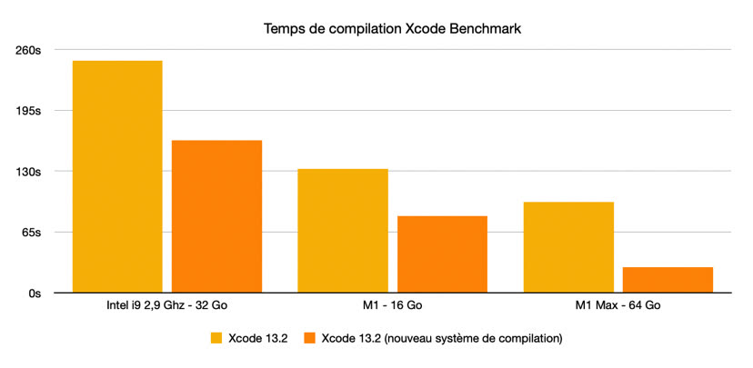 Testy przeprowadzono w systemie macOS 12.1 przy użyciu Xcode 13.2. Pomiary zostały wykonane z nowym systemem kompilacji Xcode 13.2 włączonym za pomocą polecenia i bez niego defaults write com.apple.dt.XCBuild EnableSwiftBuildSystemIntegration 1.