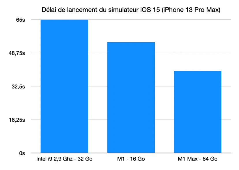 Wziąłem więc projekt, którego uruchomienie było żmudne, i zmierzyłem czas między kliknięciem, aby uruchomić aplikację, a wyświetleniem pierwszego ekranu, zaczynając od symulatora pozbawionego jakiejkolwiek instalacji. Zysk między i9 a M1 wynosi około 20%. A jeśli przejdziemy z M1 na M1 Max, zysk wyniesie 35%.