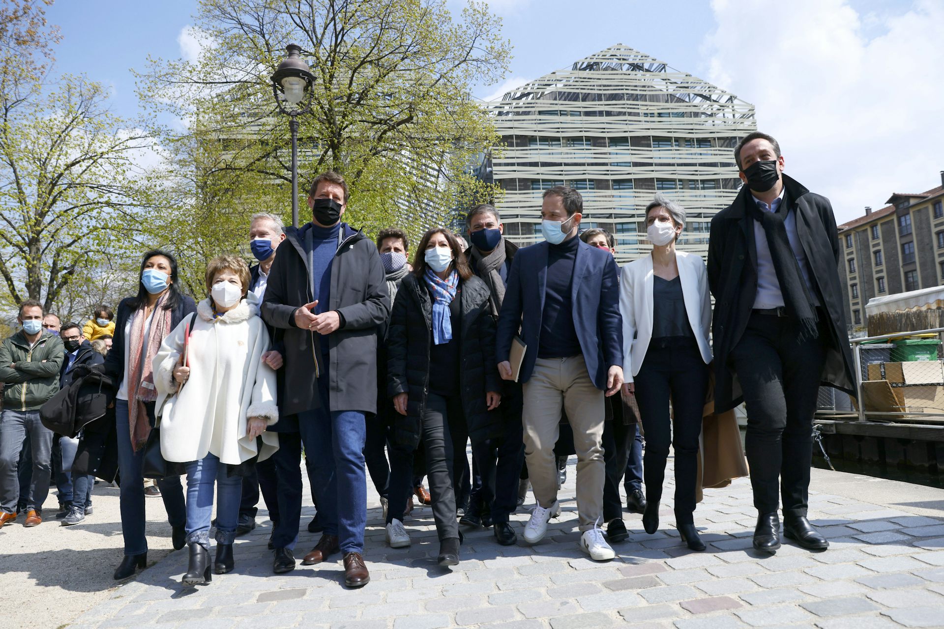 17 kwietnia 2021 r. główni członkowie francuskich partii socjaldemokratycznych i ekologicznych zebrali się po spotkaniu w celu ewentualnego sojuszu na wybory prezydenckieSandrine Rousseau (EELV), Benoît Hamon (Générations), Olivier Faure (PS), Anne Hidalgo (PS), Julien Bayou (EELV), eurodeputowany z ramienia Zielonych EELV Yannick Jadot i była minister środowiska Corinne Lepage po spotkaniu przywódców lewicy w świetle wyborów prezydenckich 2022, 17 kwietnia 2021 w Paryżu. Thomas Samson / Agence France-Presse