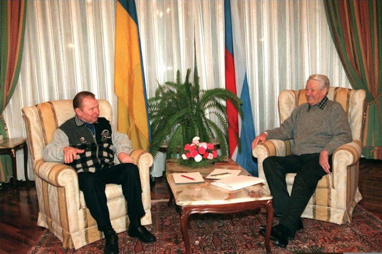 Ale stosunki z Moskwą są skomplikowane, która z trudem uznaje niepodległość Ukrainy, którą wielu rosyjskich polityków i intelektualistów uważa za kolebkę państwa rosyjskiego. Początki prezydentury Leonida Kuczmy (1994-2005) dążyły do złagodzenia napięć. W maju 1997 r. pierwsza wizyta Borysa Jelcyna w Kijowie doprowadziła do podpisania porozumień o podziale Floty Czarnomorskiej, dawniej sowieckiej i stacjonującej w porcie Sewastopol na Krymie, oraz o dwudziestoletniej dzierżawie tego portu przez Rosję. . ; Traktat o przyjaźni, współpracy i partnerstwie świadczy o uznaniu przez Moskwę granicy z Ukrainą.